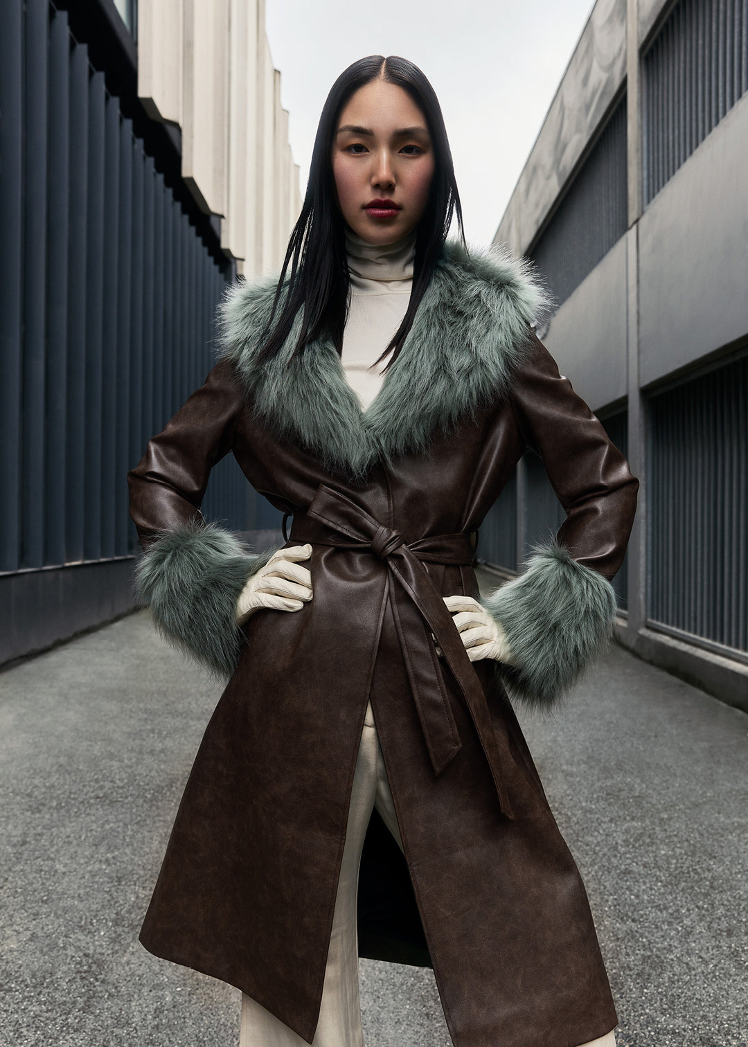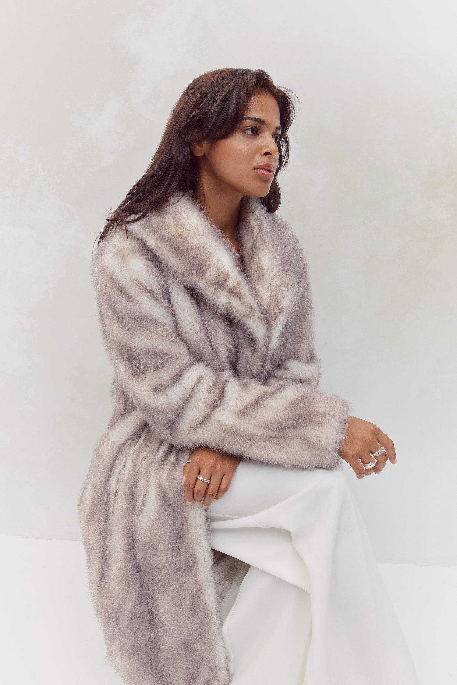A timeless faux fur coat with a cosy shawl collar and satin lining for added comfort and sophistication.
