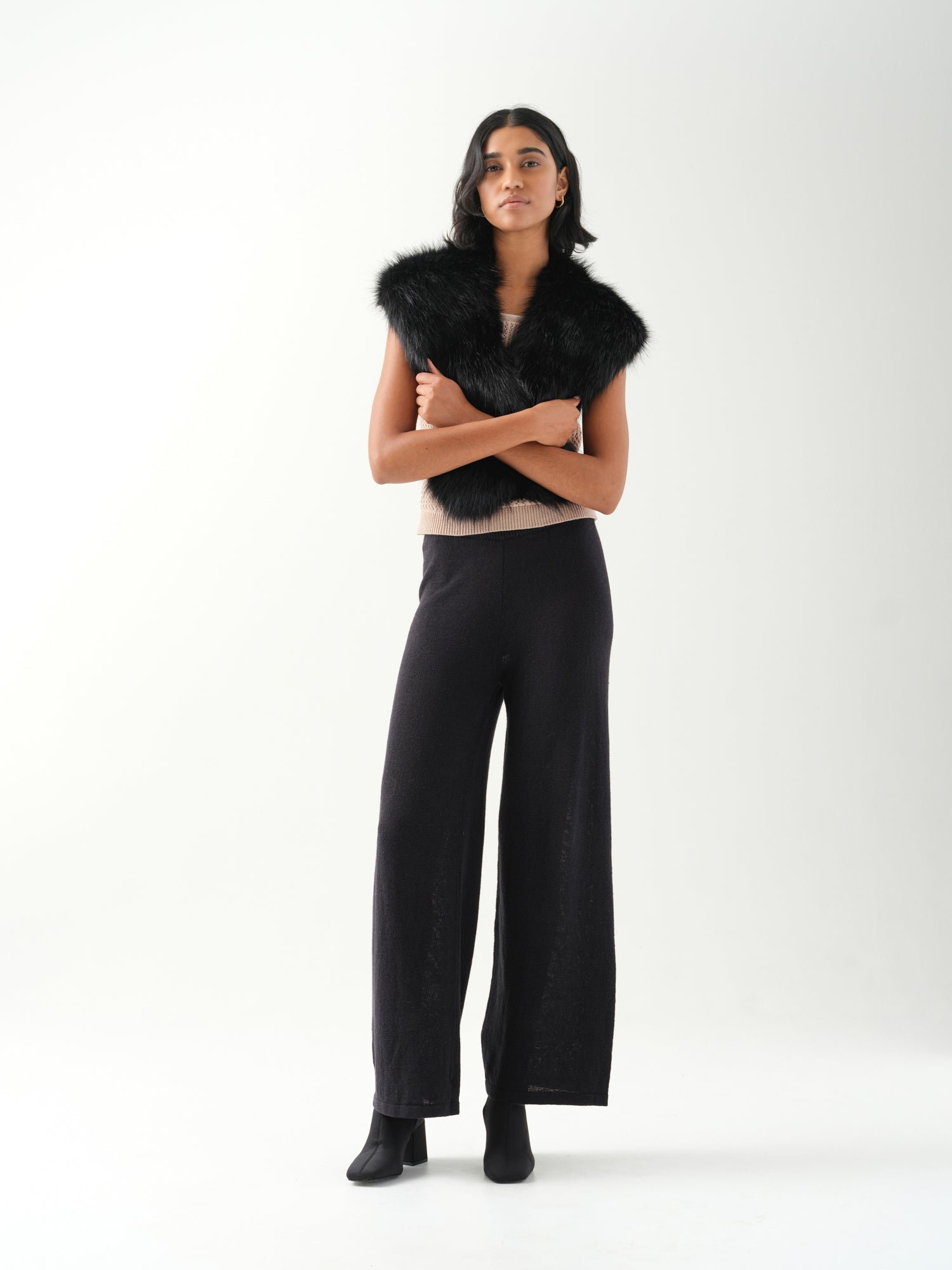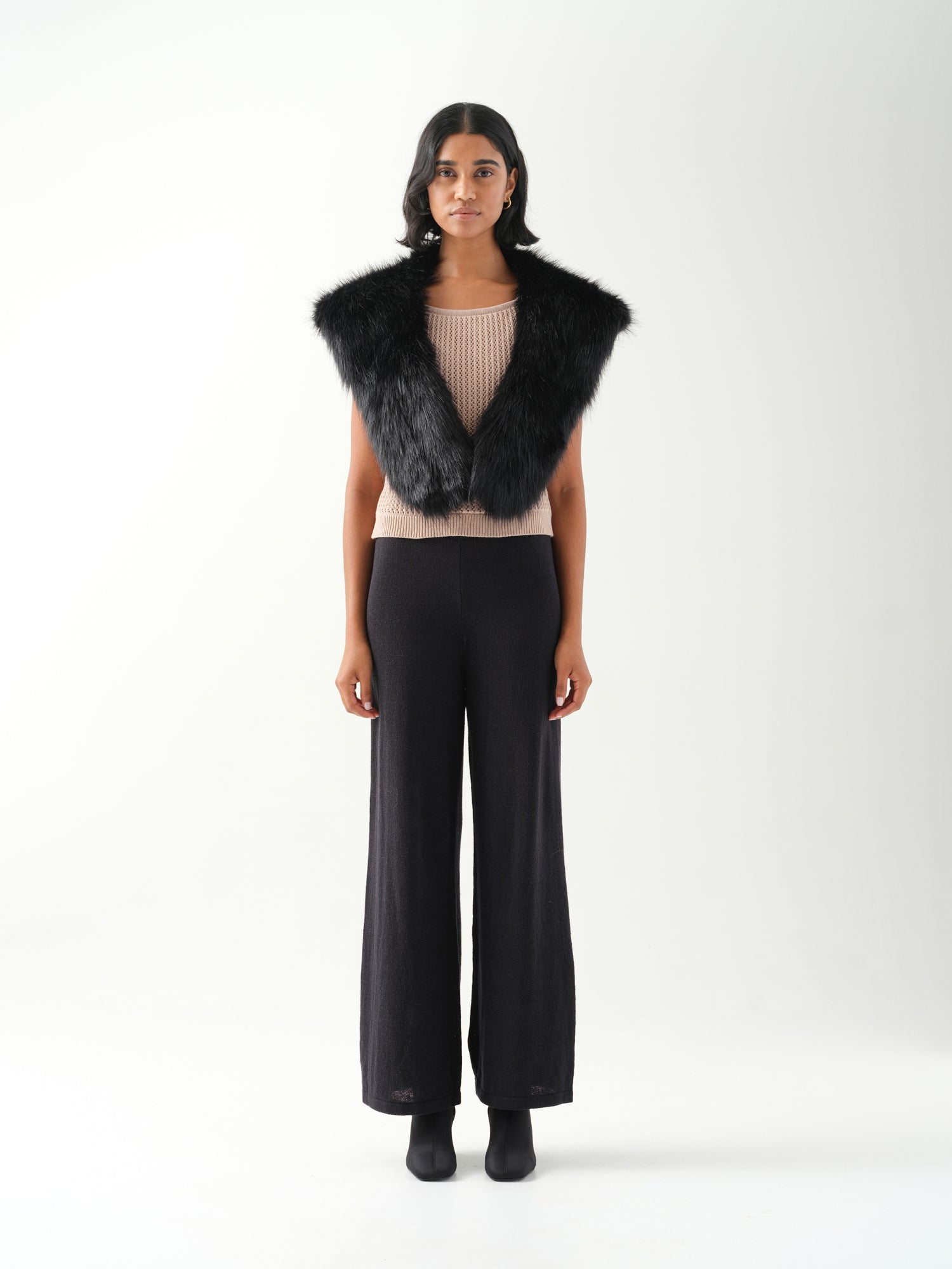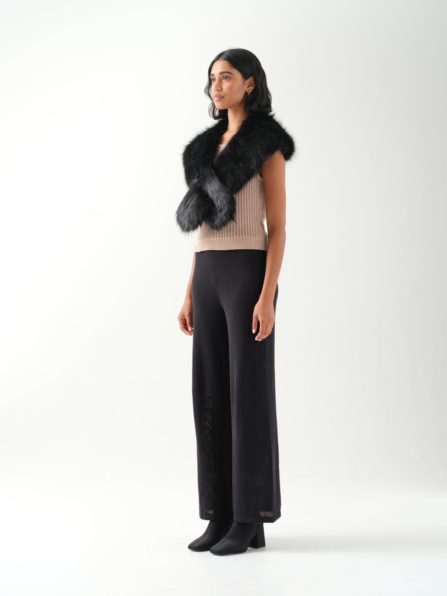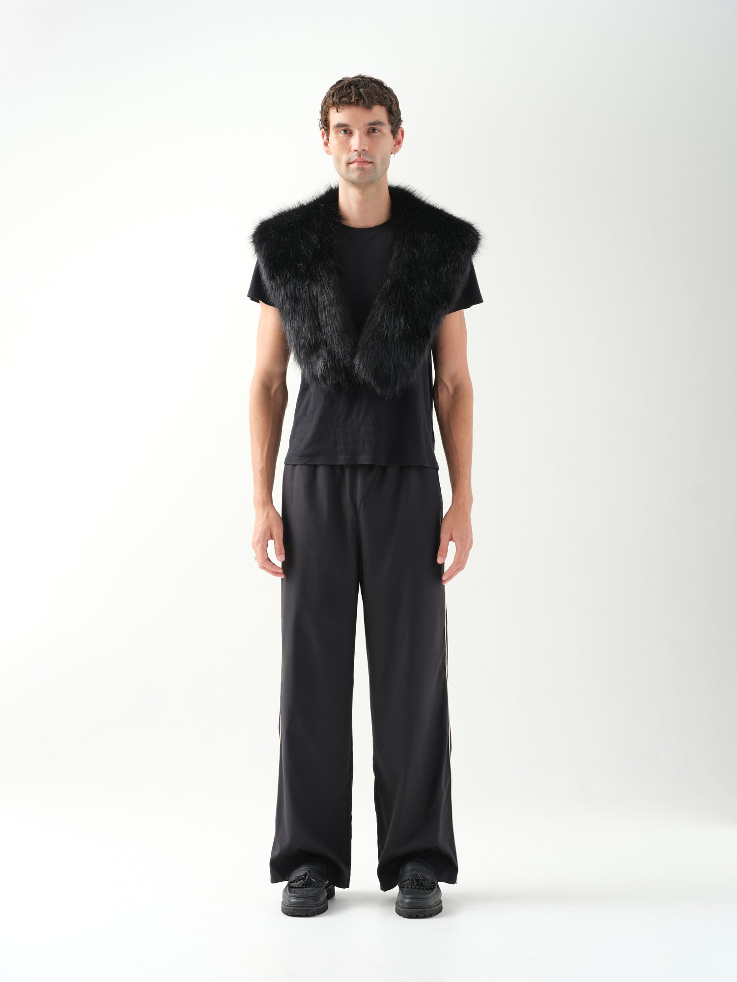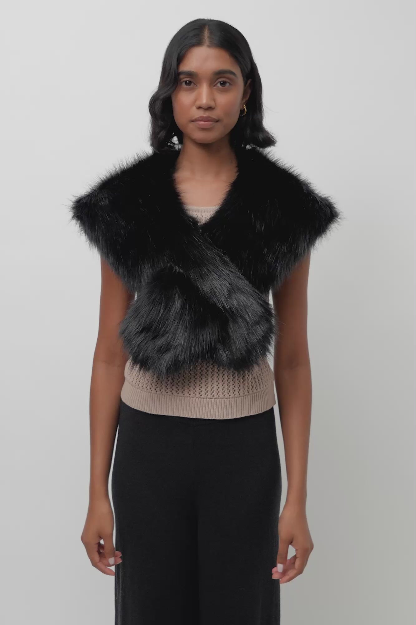A minimalist staple with maximum impact. The Thread-Through Scarf in Black is constructed from dense, high-pile faux fur, delivering warmth and structure in equal measure. Its deep noir tone and classic silhouette make it an enduring cold-weather companion.