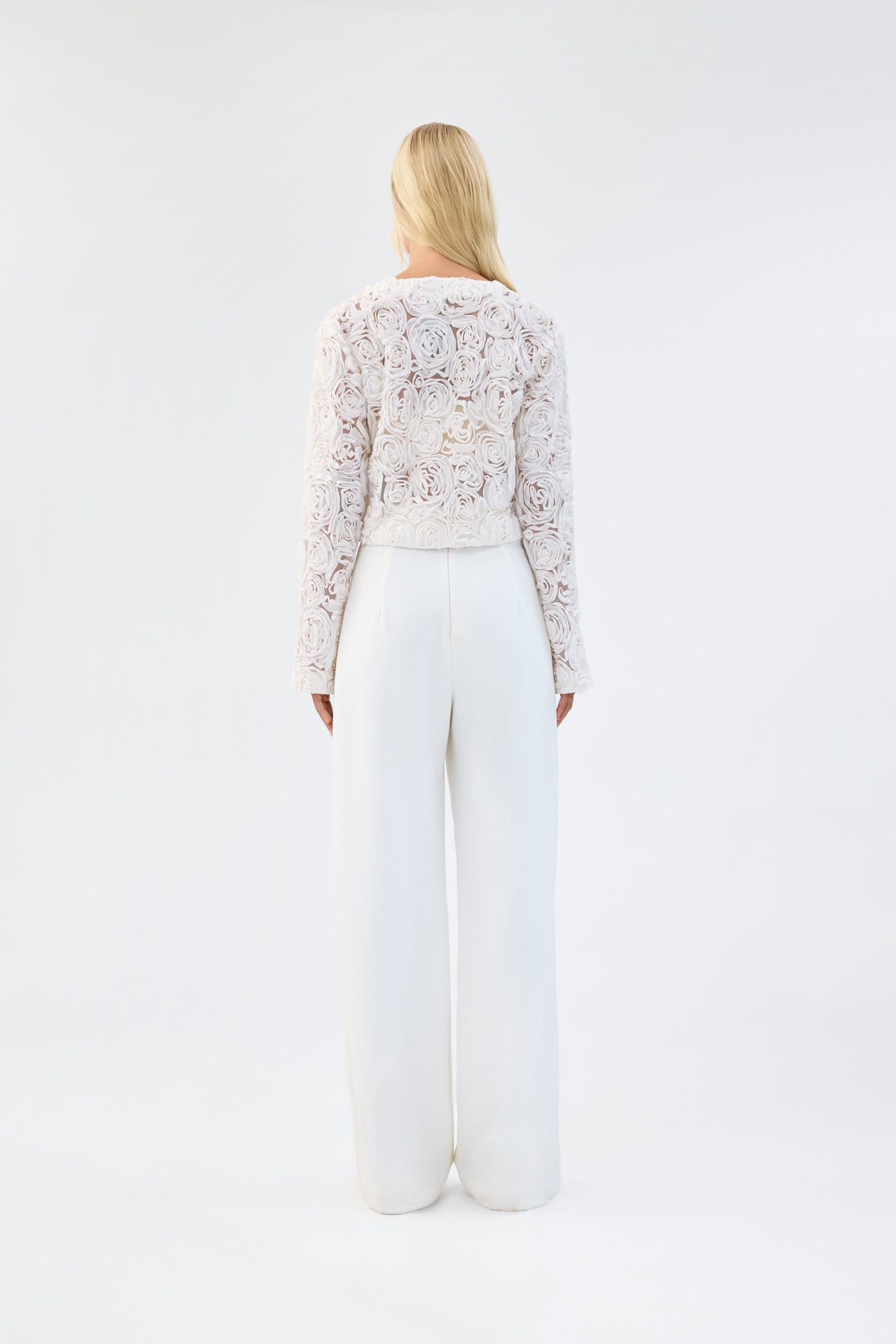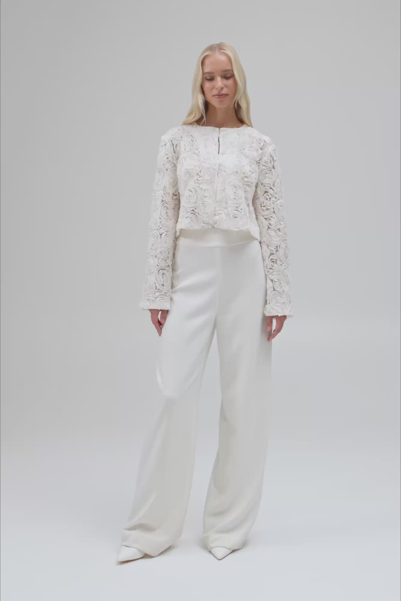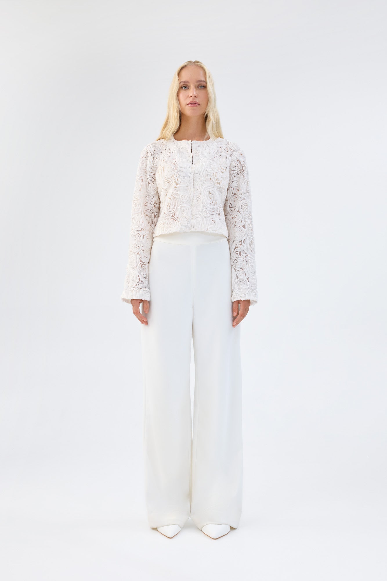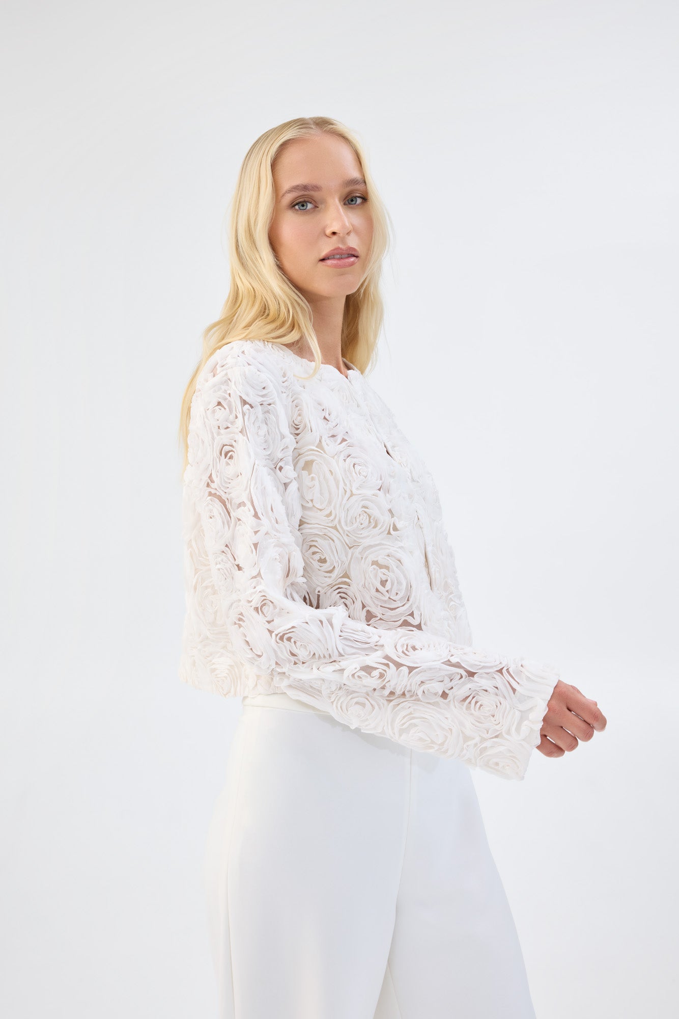 The Rosa Jacket in Blanc captures a delicate and romantic aesthetic. Sheer floral tulle appliqué fabric creates an airy, textured effect. Unlined and slightly stretchy, the jacket features a round neckline and secures with self-covered hook and eye closures, providing a cruelty-free finishing touch.