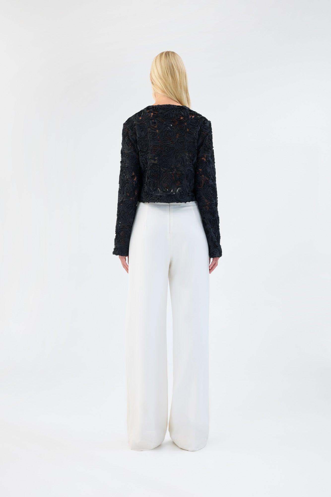 The Rosa Jacket in Black delivers a bold yet refined interpretation of bridal outerwear. Designed with sheer floral tulle appliqué, this slightly oversized jacket balances structure with softness. It remains unlined for lightweight wear and secures with self-covered fastenings, making it a cruelty-free option for the modern bride.