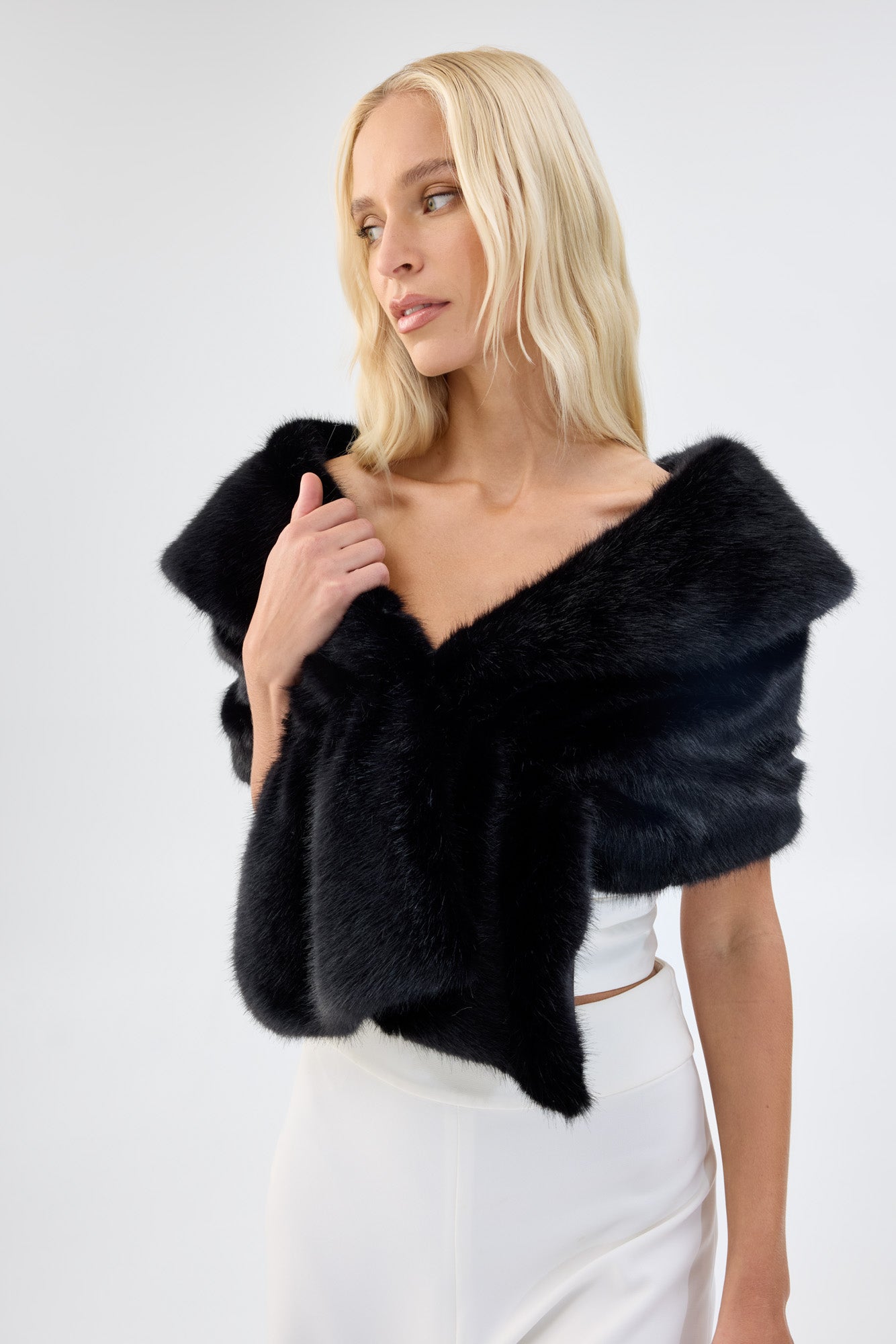 The Champagne Wrap adds timeless and ethical style to the celebration with ultra-soft short length faux fur and a cozy oversized fit around the shoulders and arms. The Champagne Wrap is constructed with plush short length faux fur and features a snap hook and eyelet for closure in the front.