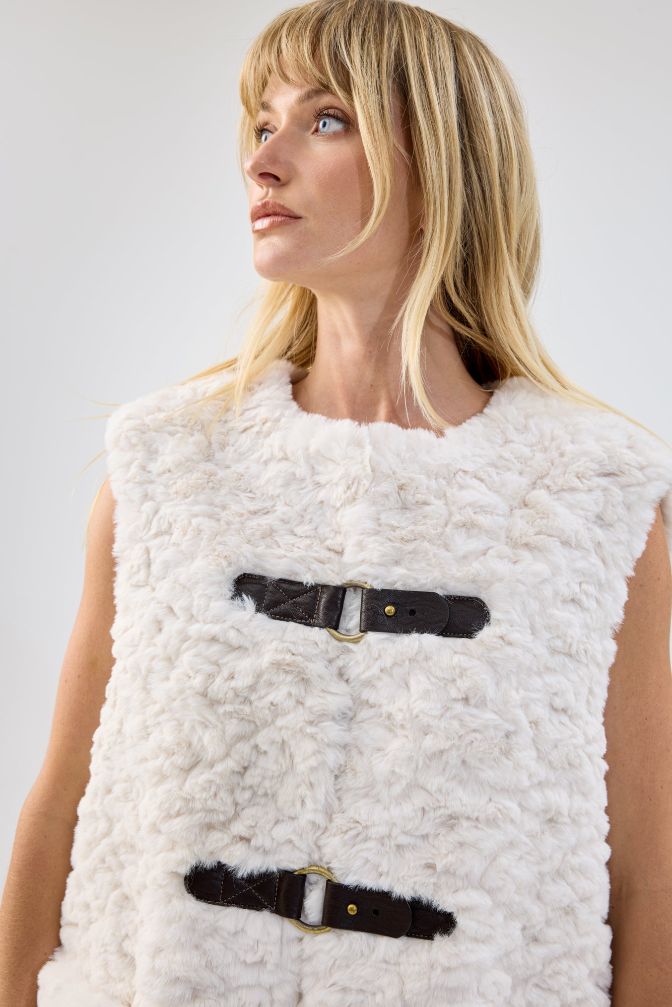 A lush faux shearling wool vest in a classic colourway. Featuring faux leather buckle closures, two front pockets and a cropped neckline. Pair the Dandy Vest with jeans or a skirt for a cosy casual look this season and next.