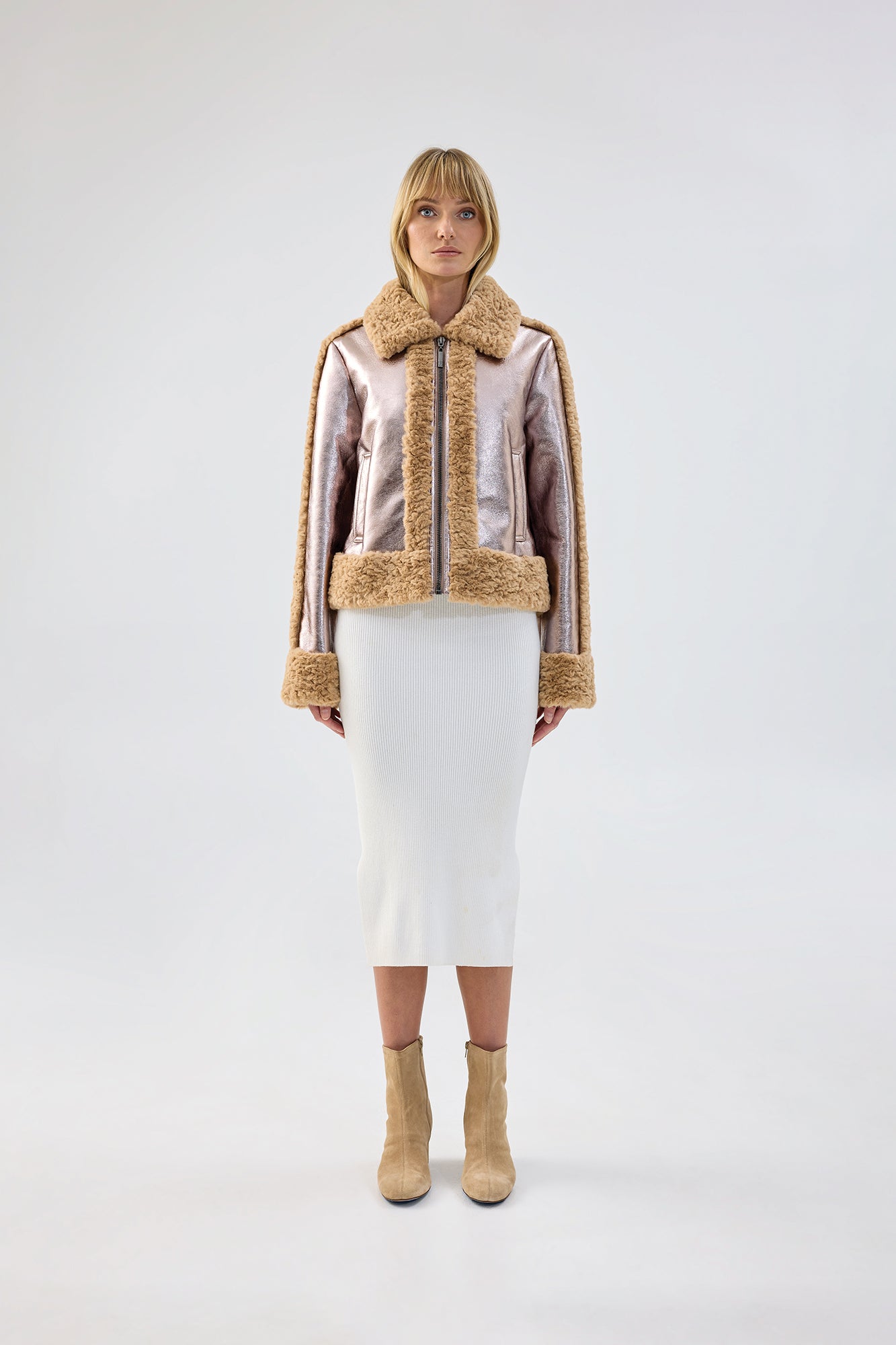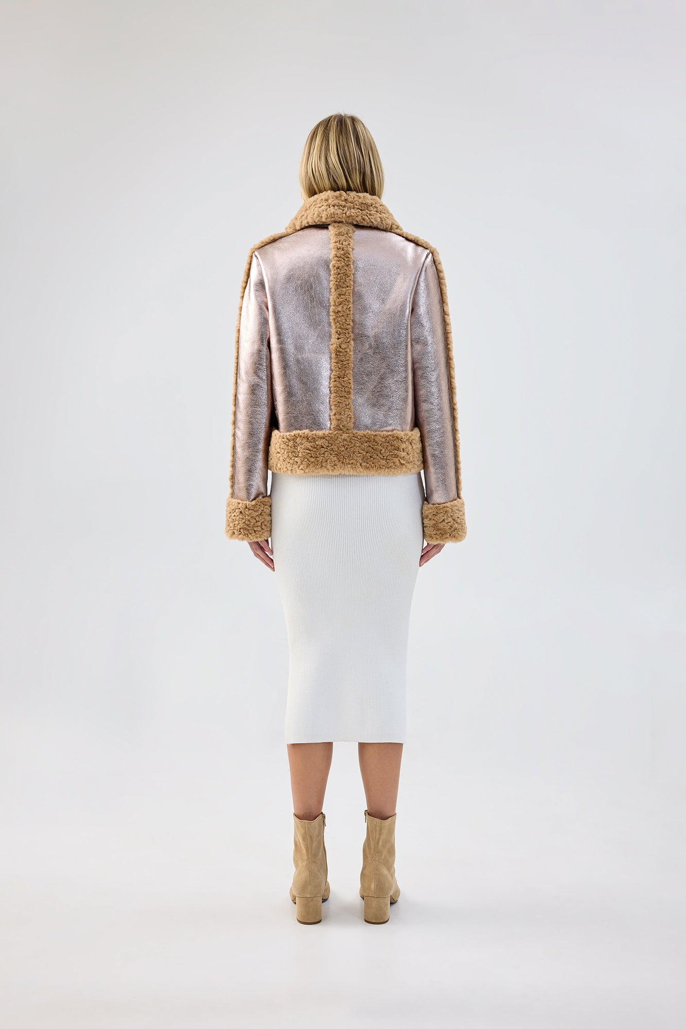 A patent aviation jacket design, with a metallic taupe multi-fabrication outer shell. This style features faux shearling panel joining along the front and back of the jacket. This style reaches the hips and features satin lining and twin front pockets.