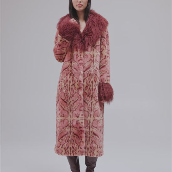 The Cuvée Rose Coat merges artistry with utility. Highlighted by jacquard faux fur and custom snake outline detailing, this piece pairs contrast shearling accents with a luxurious silhouette that stands out effortlessly.