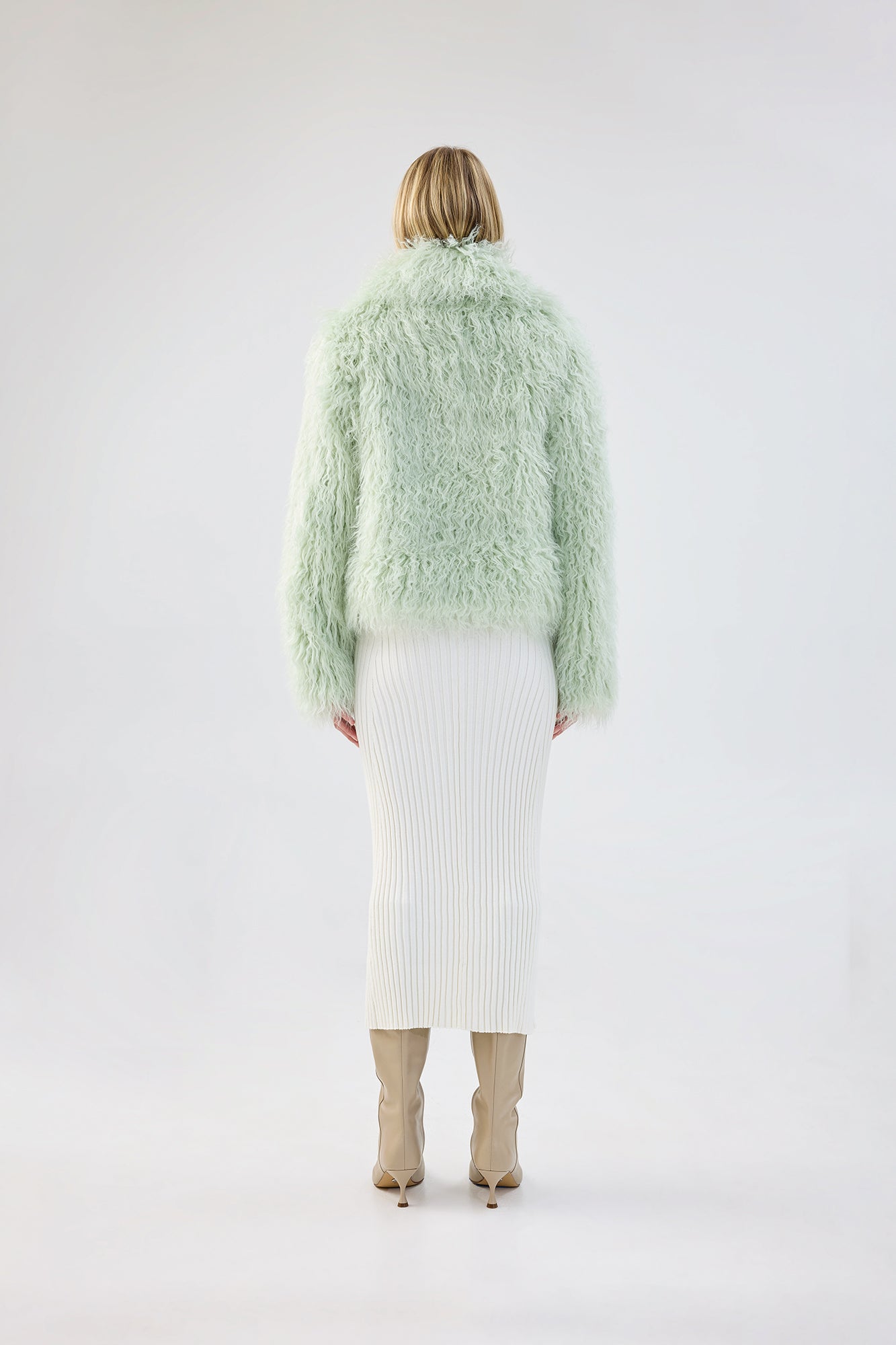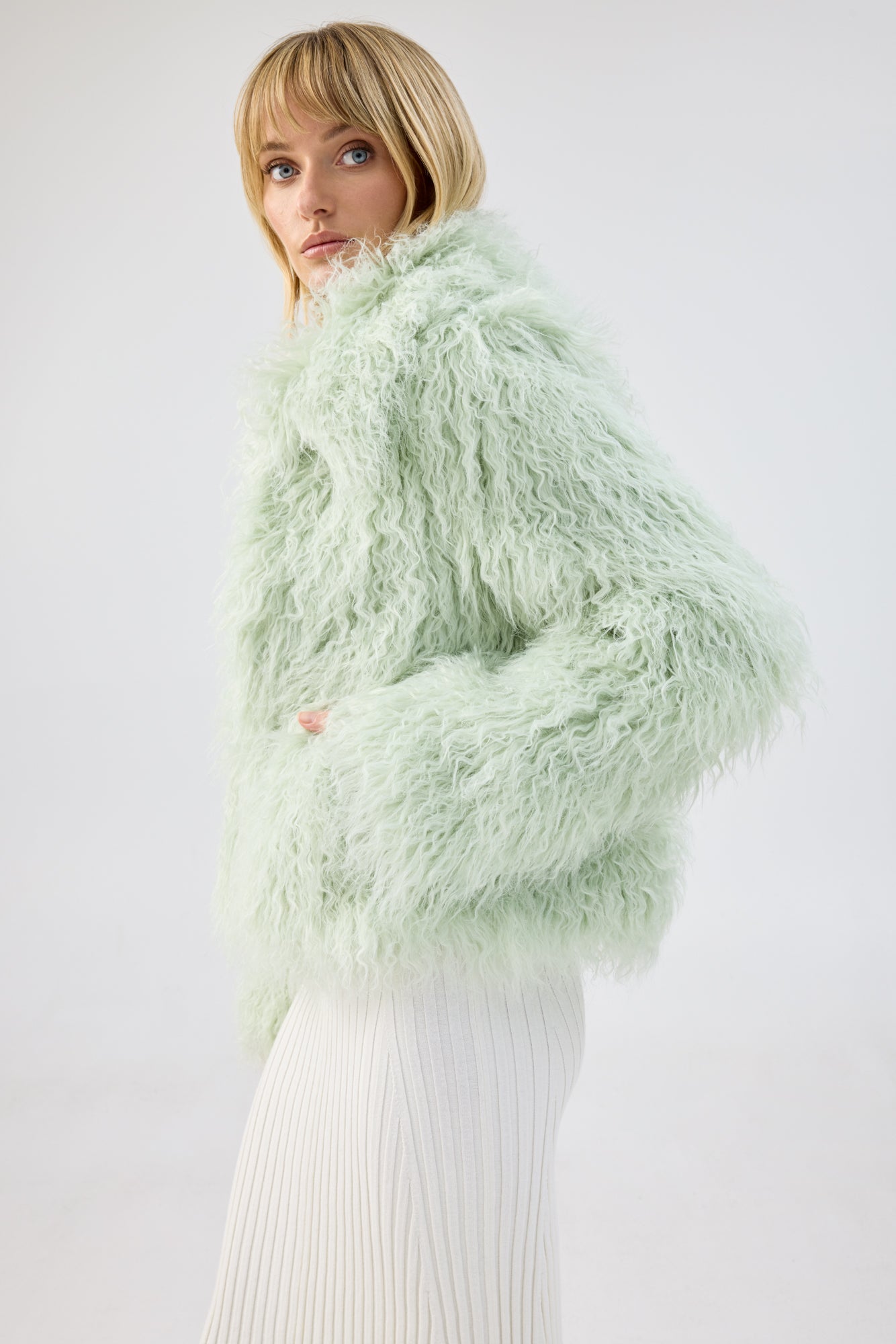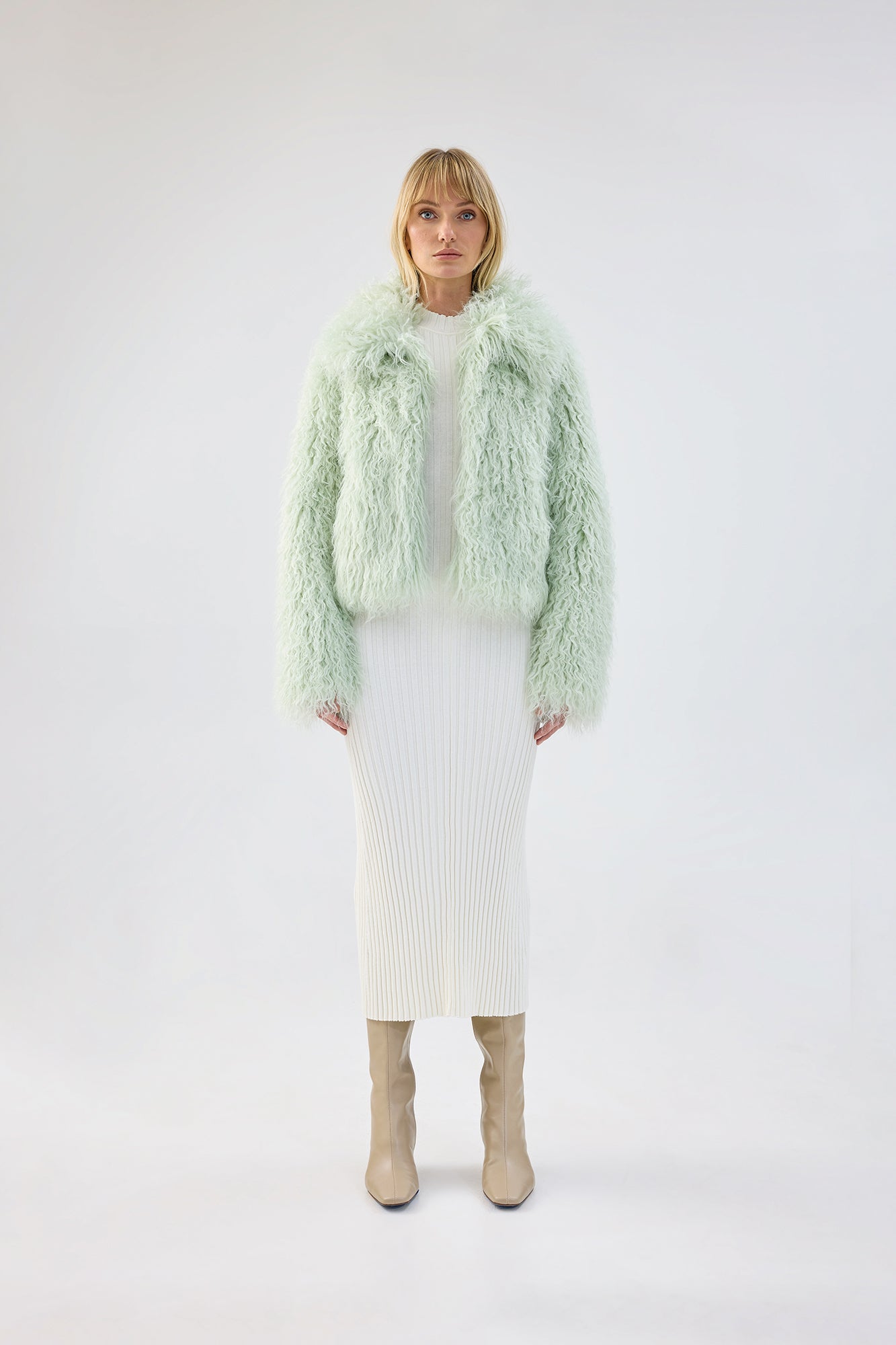 The Saint Tropez Jacket is a faux fur jacket with a dramatic collar and lush exterior. Designed with a cropped bodice and twin front pockets, this warm style works effortlessly over a dress or pants for a high impact styling moment.
