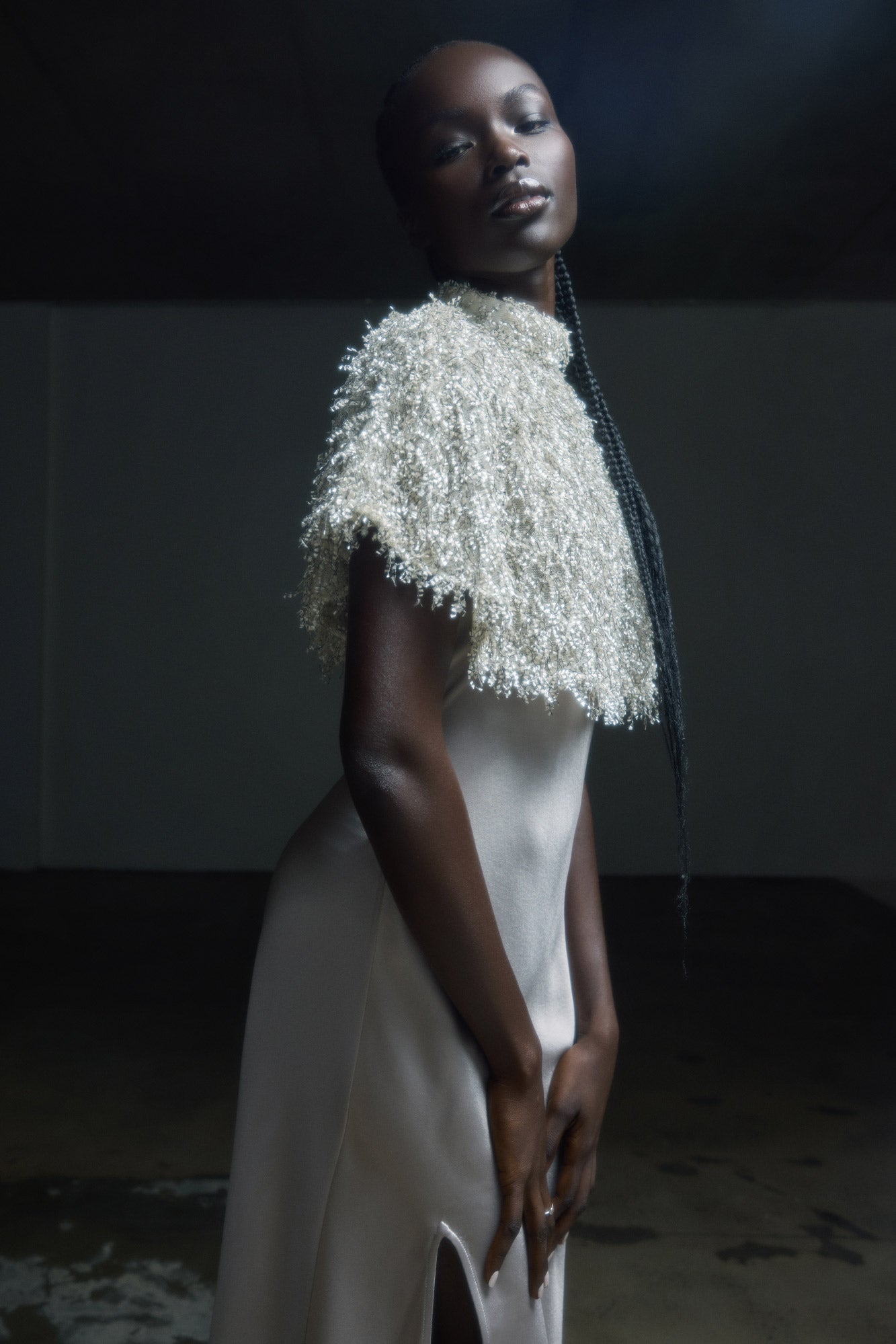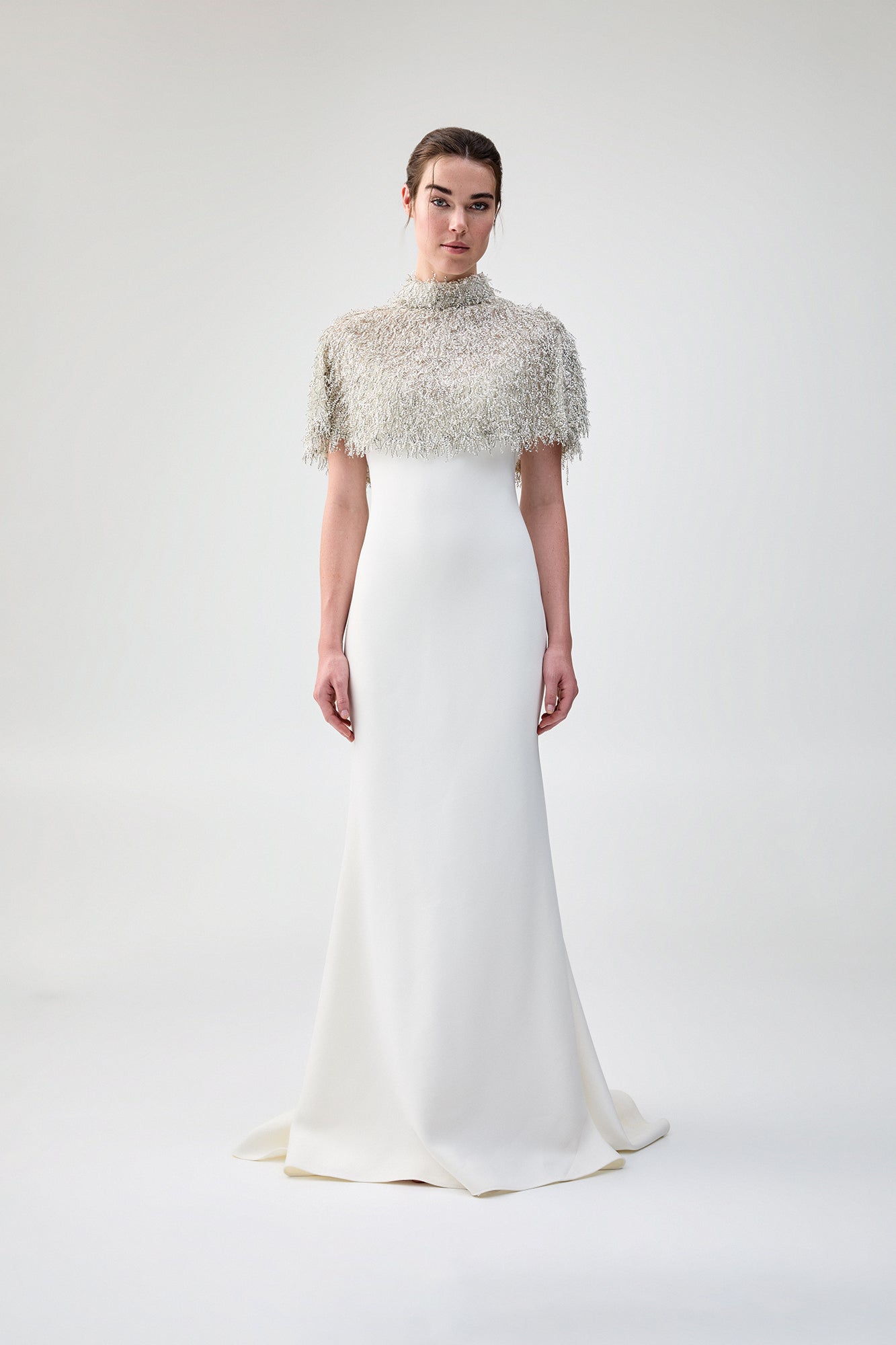 Crafted from a bespoke feather look fabrication, a high collar, and four button closers along the back. The Cape Bon adds dimension to the silhouette of any occasion look.