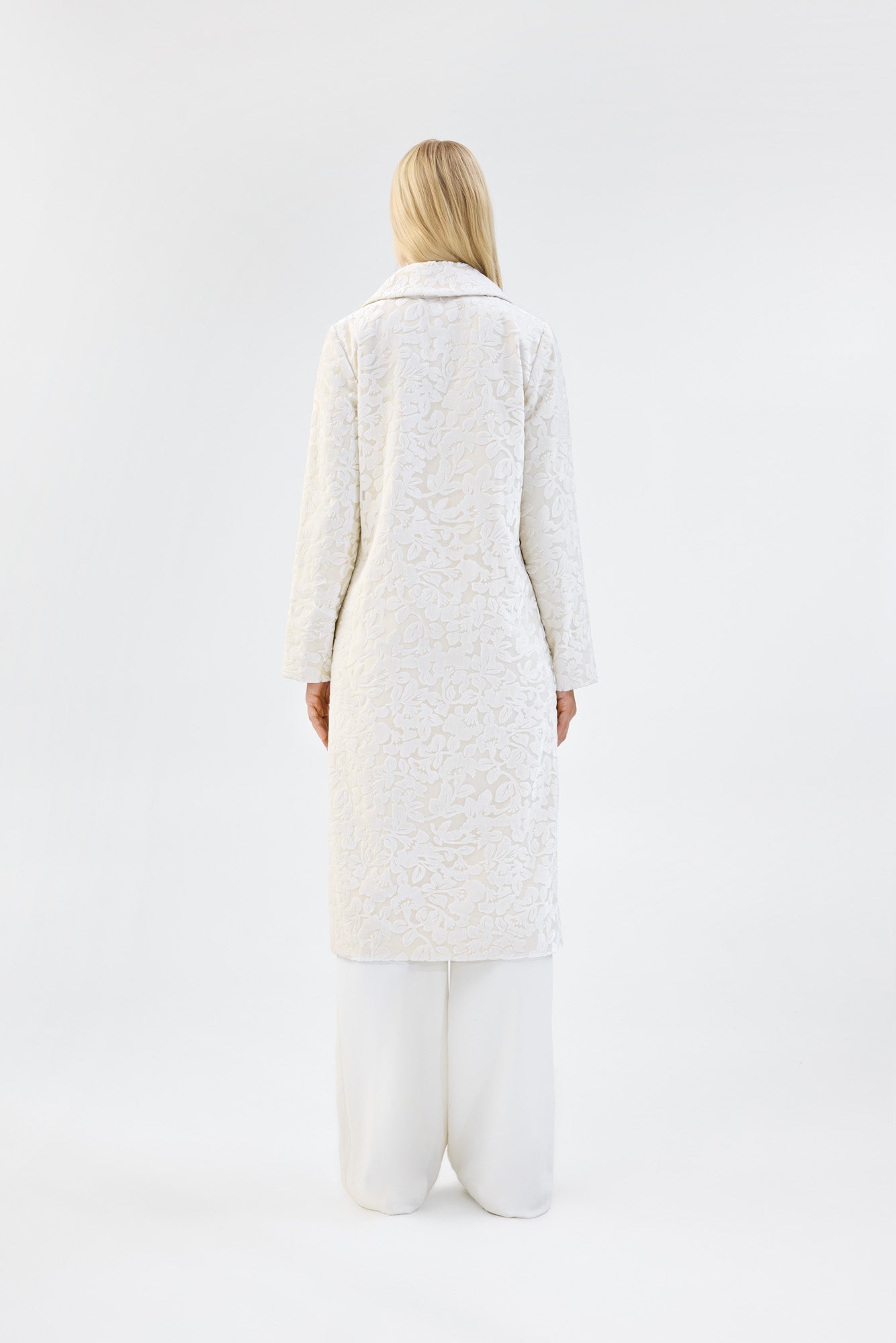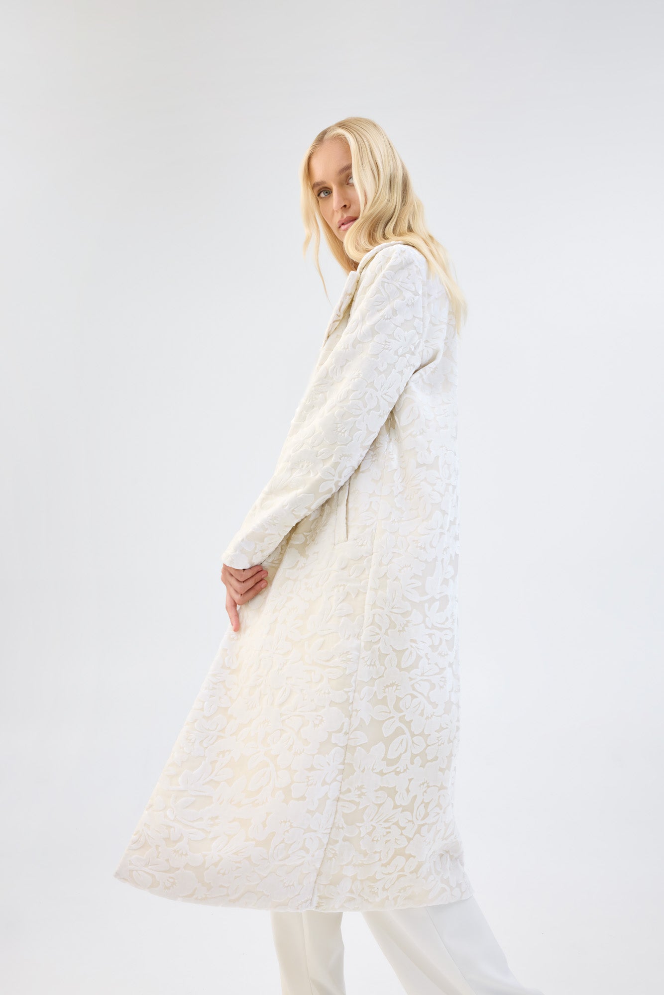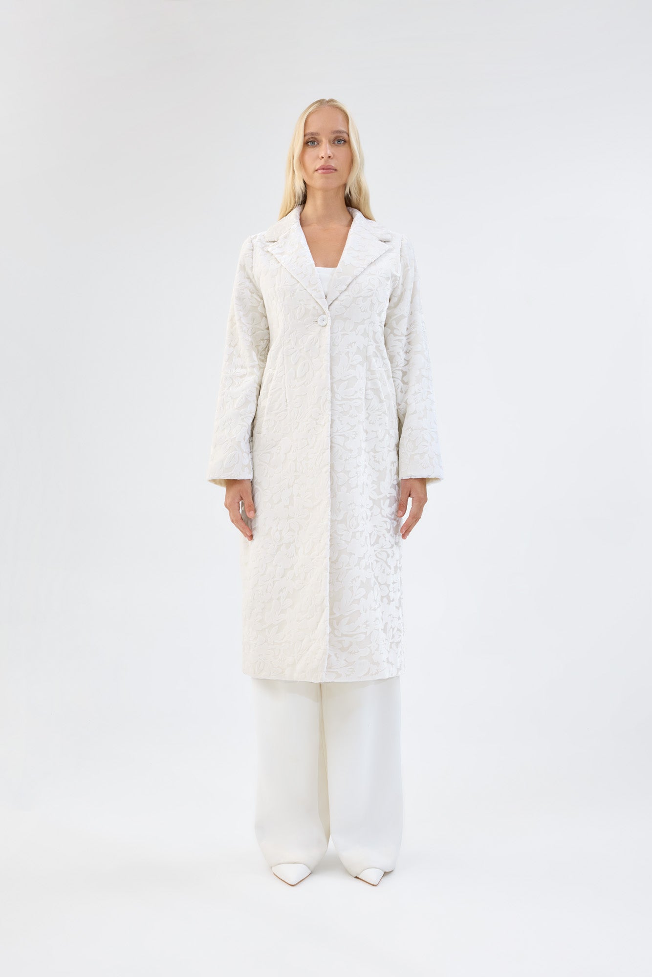 A velvet duster coat with a contemporary lace outfitting. The Romantique Coat is a luxurious layer for modern styling. This style reaches the below the knees and features satin lining and twin front pockets.