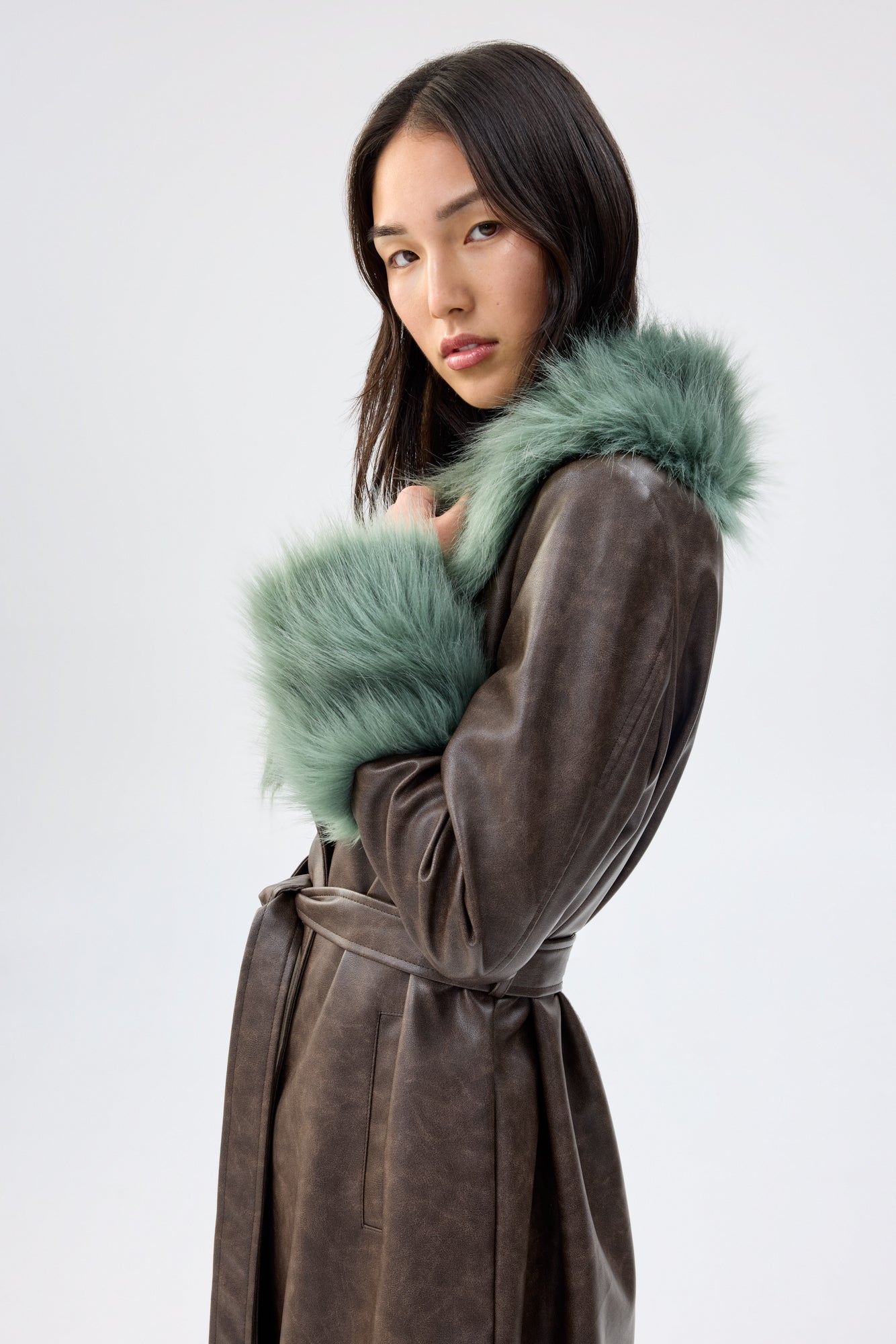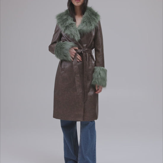 The Empathy Coat balances soft structure with tactile luxury. A PU-belted waist and lush faux fur contrasts define its silhouette, while recycled polyester lining underscores its commitment to sustainability.