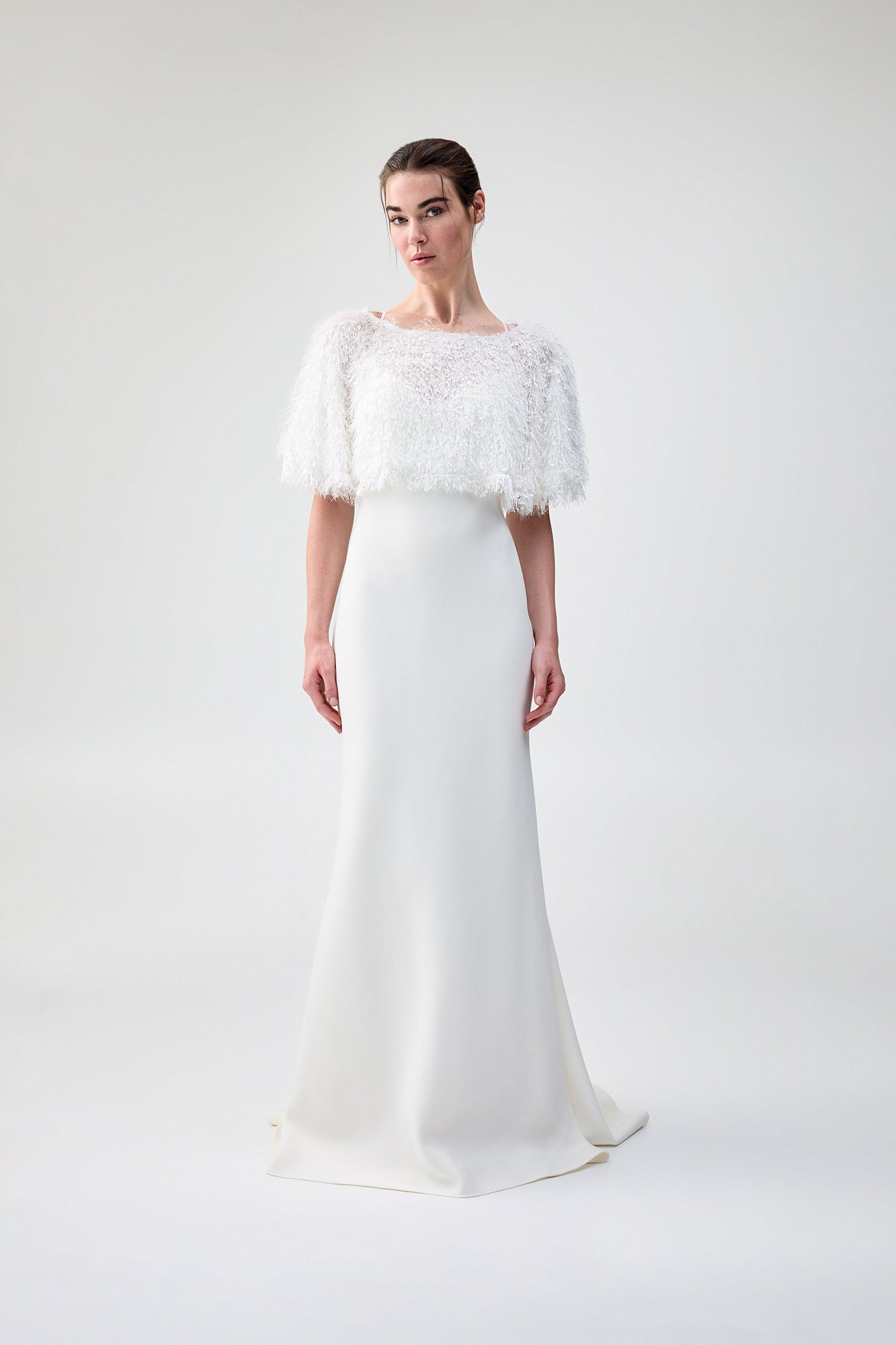The Pluma Cape is an elegant finishing touch to any bridal gown or wedding look, adorned with a bespoke feather look fabrication.