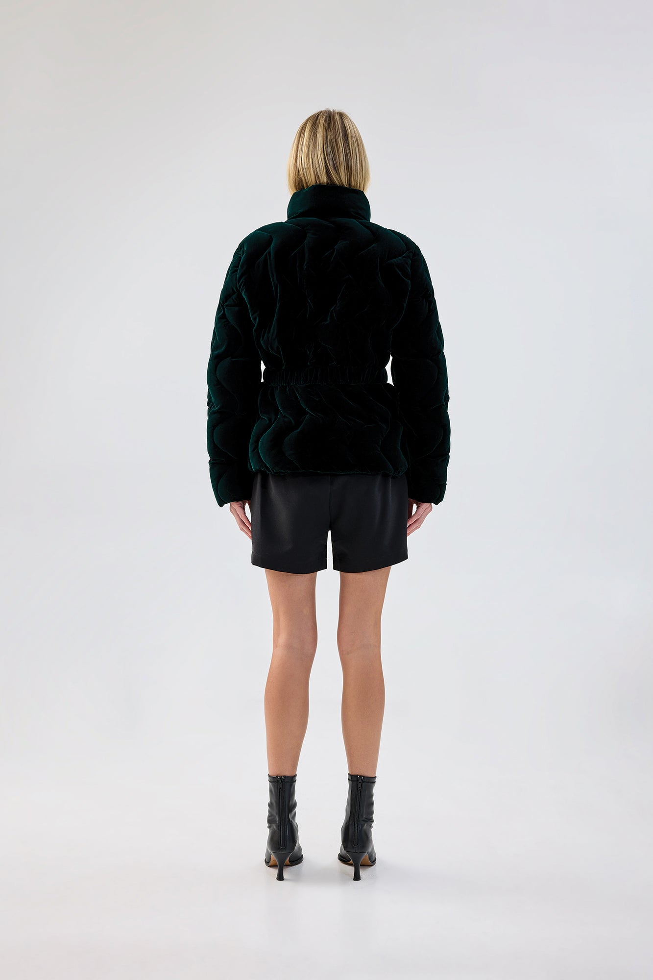 A statement athleisure piece with beauty in the details. This puffer style features wave stitch quilting, a green velvet outer shell, and an elasticized waist belt that creates a flattering and futuristic silhouette.