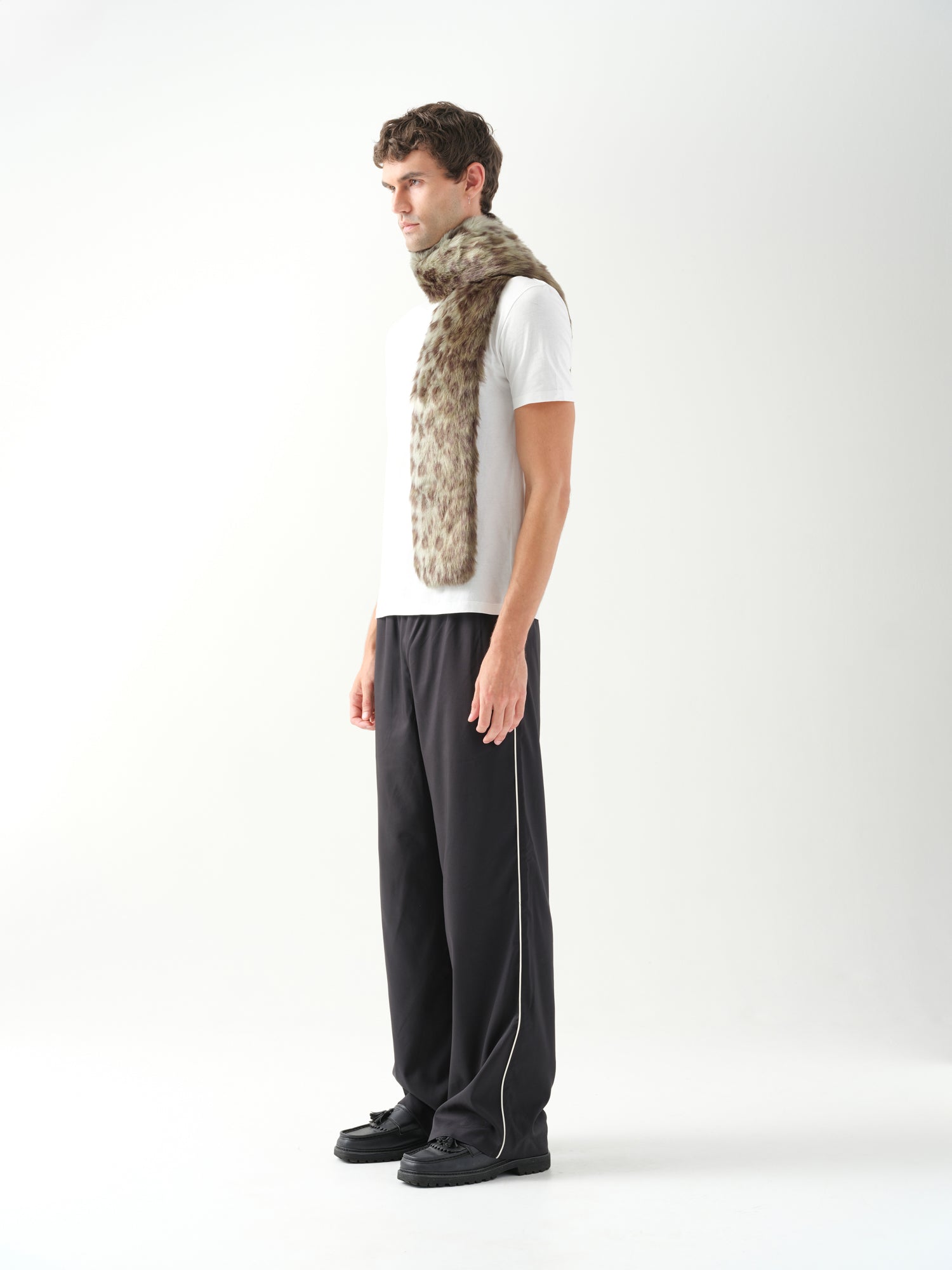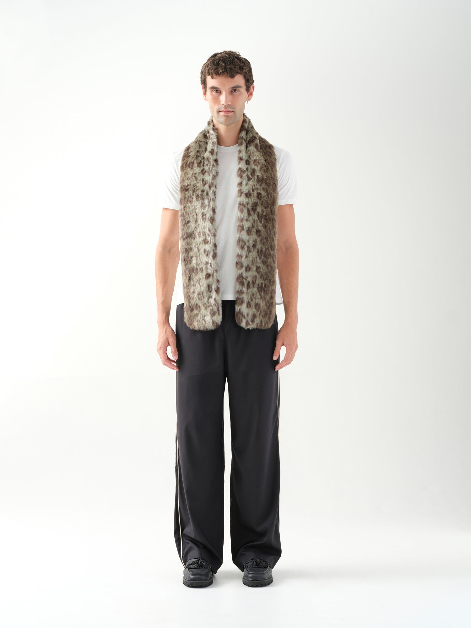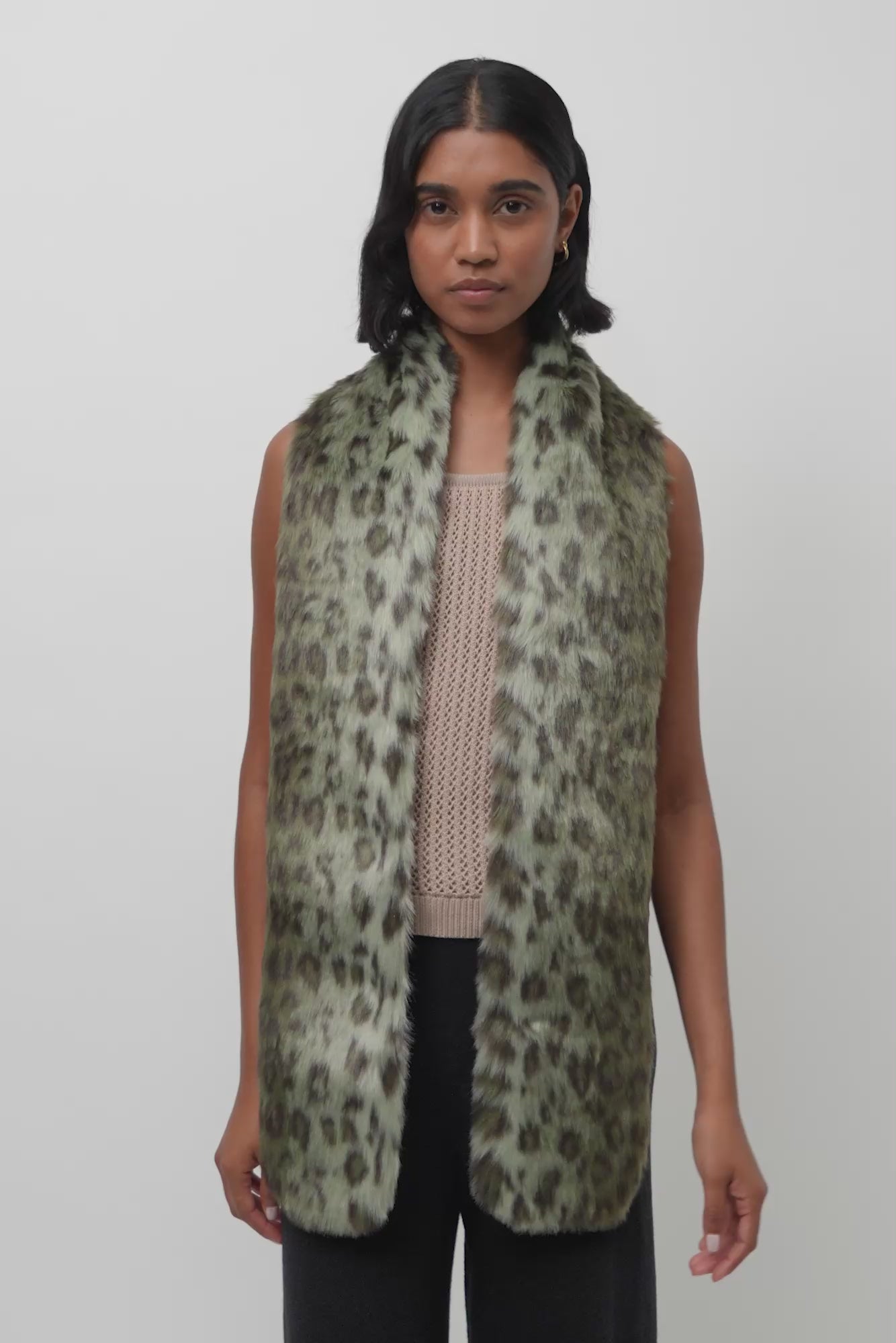 The West End Scarf in Green Leopard is crafted from ultra-soft faux fur with a smooth finish. This streamlined silhouette offers subtle volume and luxurious texture, designed to drape naturally over the neckline. A minimal statement piece suited to day-to-night styling.