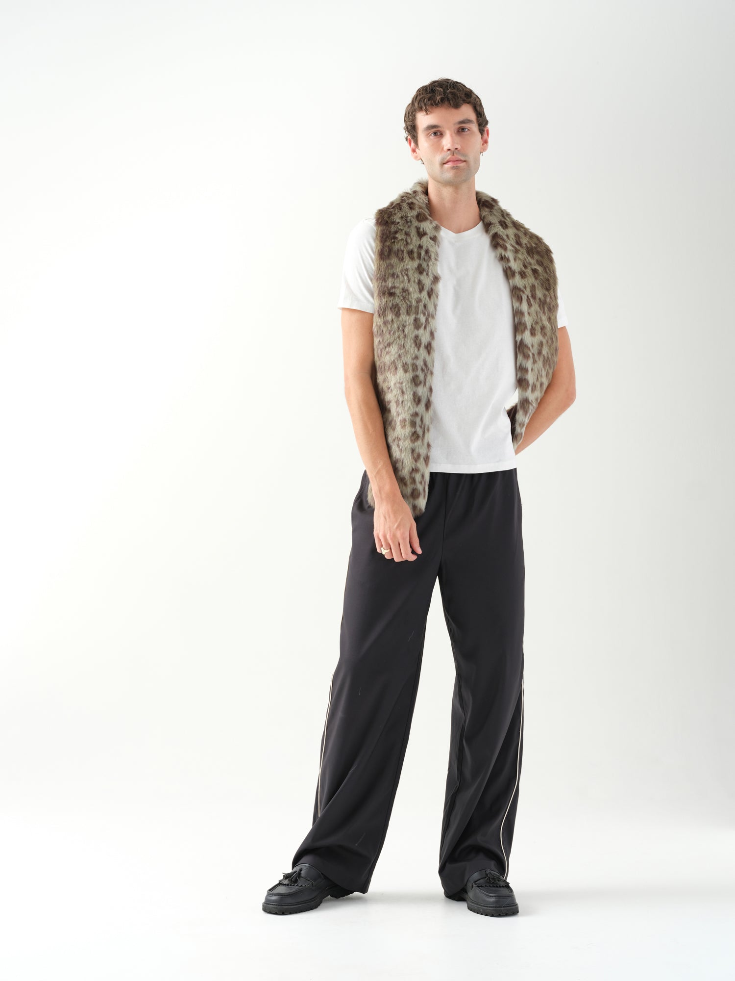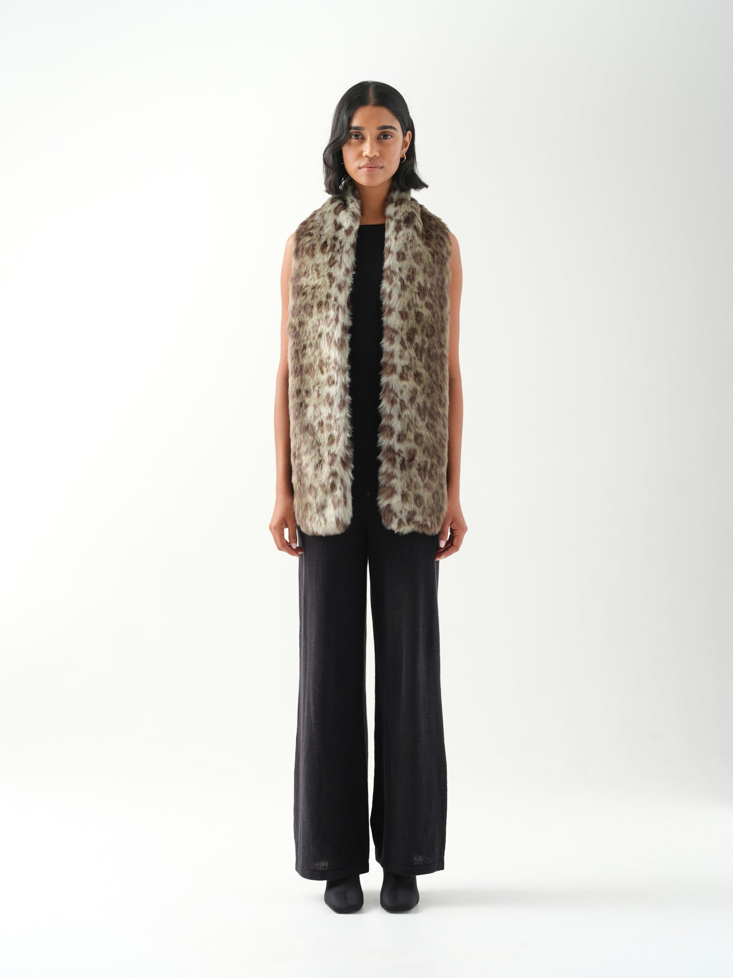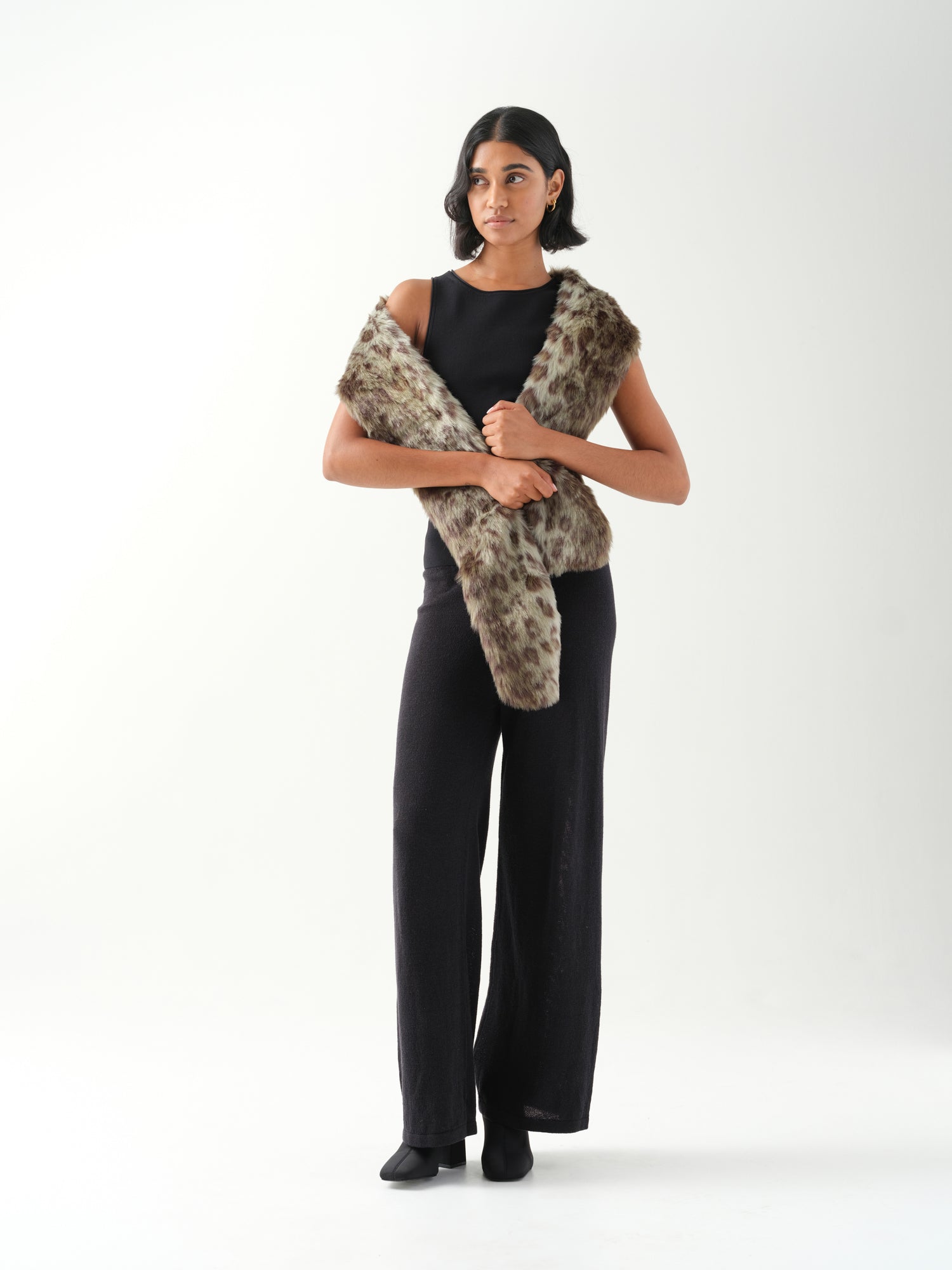 The West End Scarf in Green Leopard is crafted from ultra-soft faux fur with a smooth finish. This streamlined silhouette offers subtle volume and luxurious texture, designed to drape naturally over the neckline. A minimal statement piece suited to day-to-night styling.