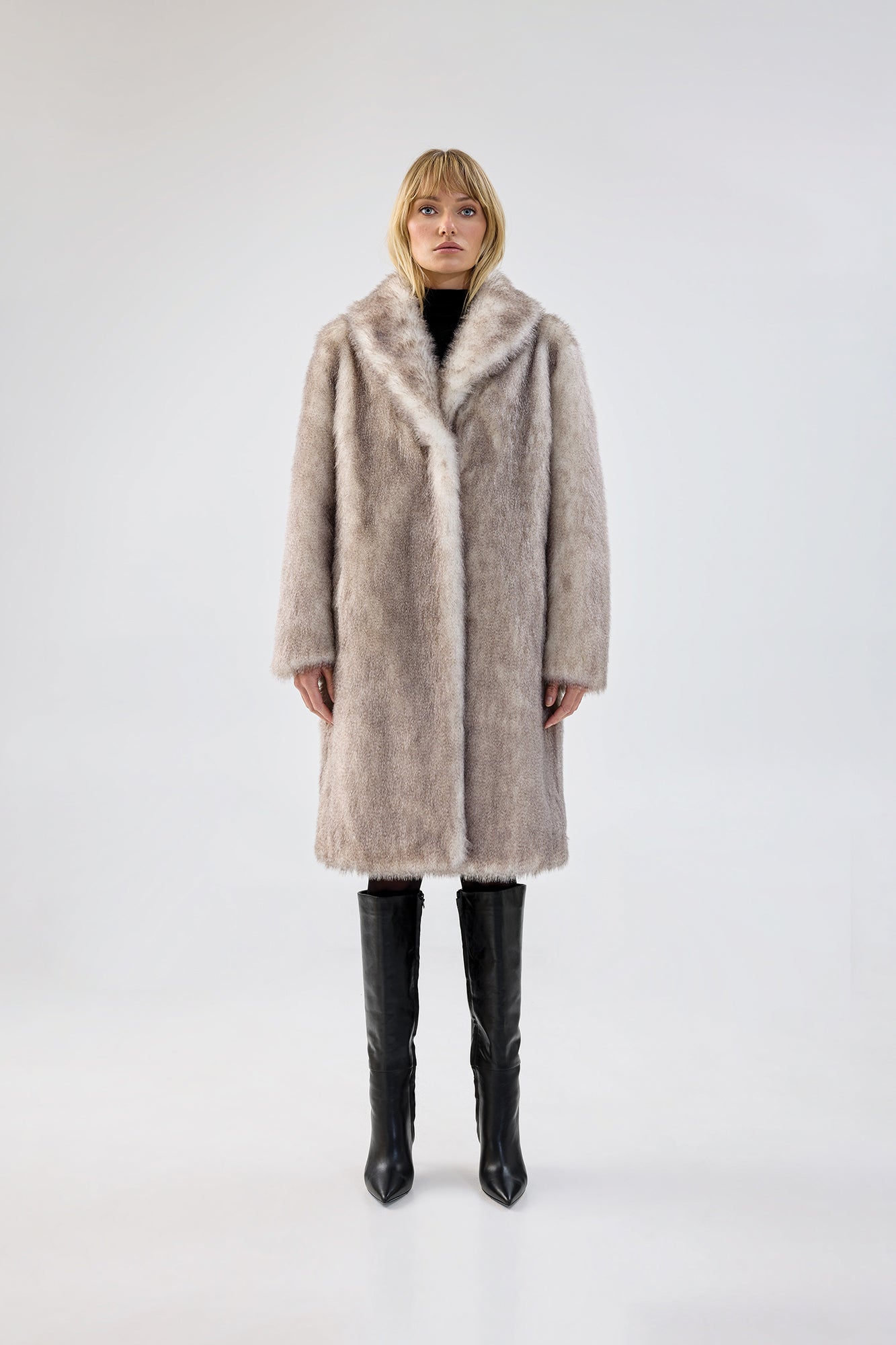 The Elixir Coat is a classic boxy coat, featuring a grey-natural outer shell with a shawl collar. An ideal added layer of luxury for any look, formal to casual. This style reaches below the knees and features satin lining and twin front pockets.